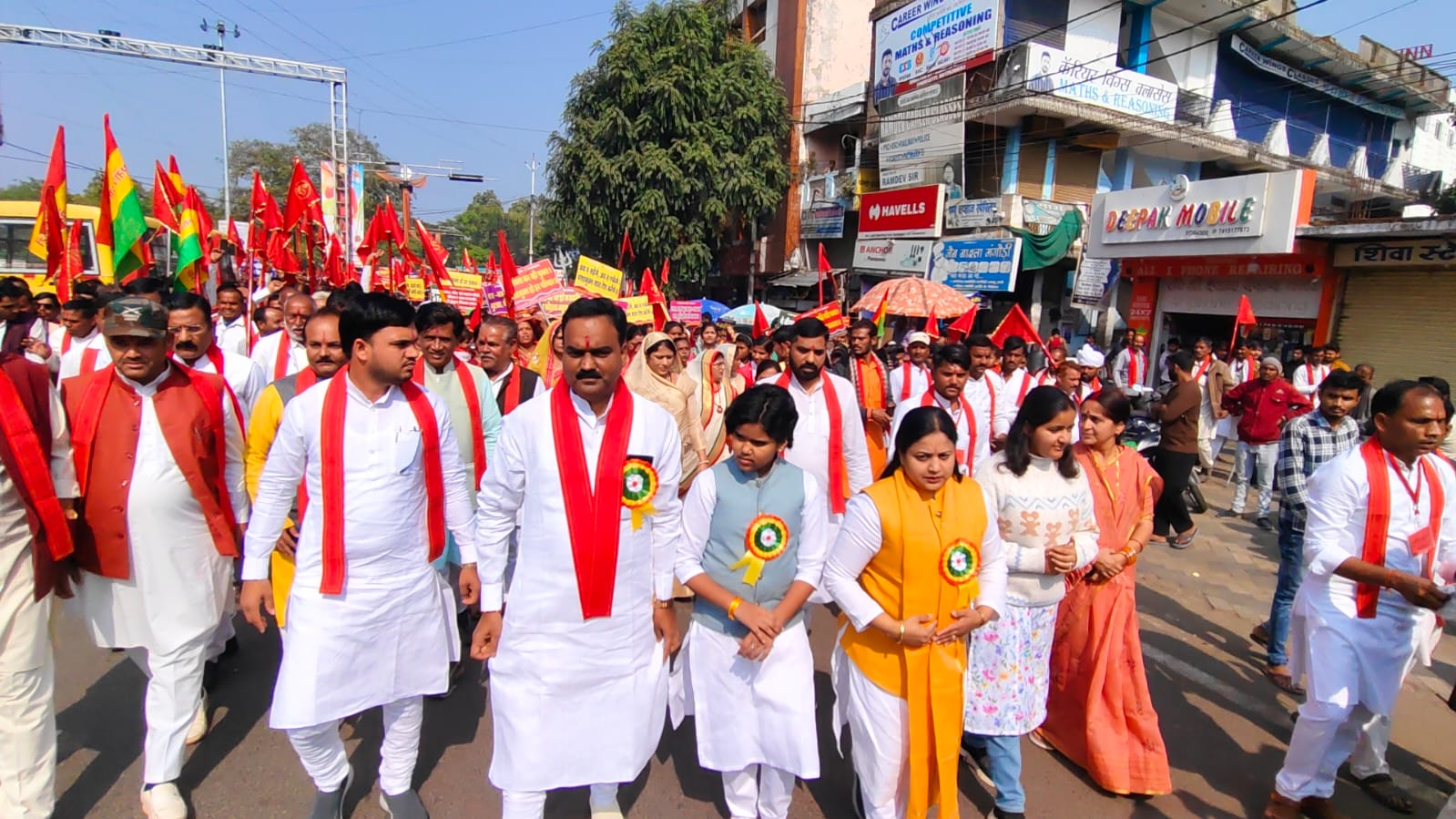सफेद कुर्ते-पायजामे और लाल गमछे में हजारों लोग कतारबद्ध चल रहे हैं। बीच-बीच में मांसाहार कभी मत करना, मानवता के पथ पर चलना... गुरुवरजी का है संदेश, नशामुक्त हो सारा देश.... होगा नारी का सम्मान, तभी बढ़ेगा देश का मान... नारे गूंज रहे हैं। सैकड़ों शंखों की ध्वनि गुंजायमान हो रही है। यह नजारा शनिवार दोपहर 12 बजे इम्मानुअल स्कूल के आसपास नजर आया। मौका था प्रदेश में शराबबंदी की मांग को लेकर भगवती मानव कल्याण संगठन की 1 किमी लंबी पदयात्रा का। संगठन अब तक सागर संभाग के गांवों में शराबबंदी अभियान चला