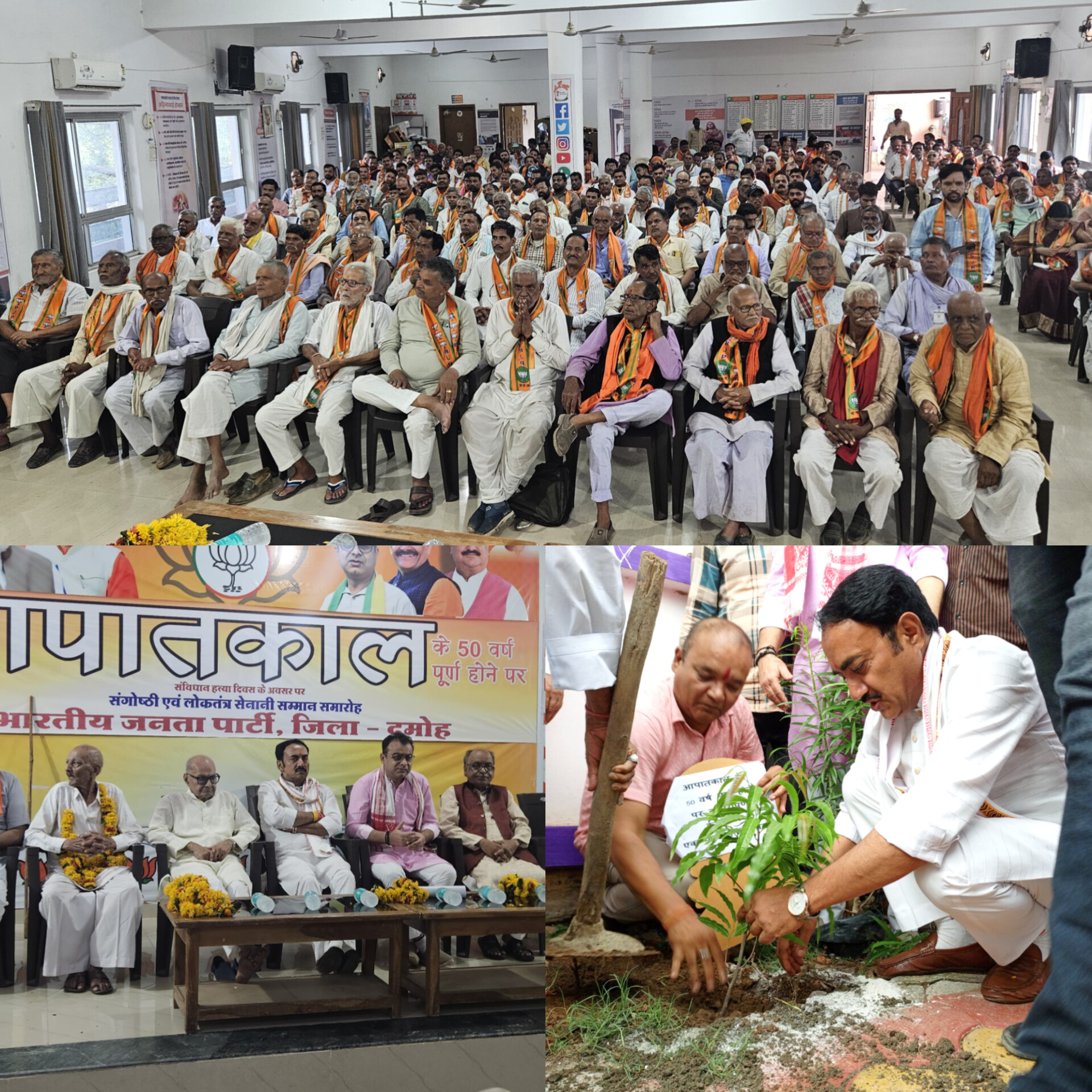 दमोह - भारतीय जनता पार्टी द्वारा आपातकाल के 50 वर्ष पूर्ण होने पर संविधान हत्या दिवस काला दिवस पर संगोष्ठी का आयोजन किया गया जिसमें पूर्व मंत्री बृजेंद्र प्रताप सिंह मुख्य अतिथि के रूप में उपस्थित रहे साथ ही पूर्व मंत्री जयंत कुमार मलैया, जिला अध्यक्ष श्याम शिवहरे, महामंत्री सतीश तिवारी, लोकतंत्र सेनानी संघ जिला अध्यक्ष निर्गुण खरे, वरिष्ठ सेनानी हुकम चंद जैन, पूर्व जिला अध्यक्ष विद्यासागर पांडे संगोष्ठी संयोजक अमित बजाज मंचासीन रहे। संगोष्ठी में लोकतंत्र सेनानी संघ एवं सभी लोकतंत्र सेनानियों का पुष्प हार पहनाकर एवं स्मृति चिन्ह प्रदान कर सम्मानित किया गया