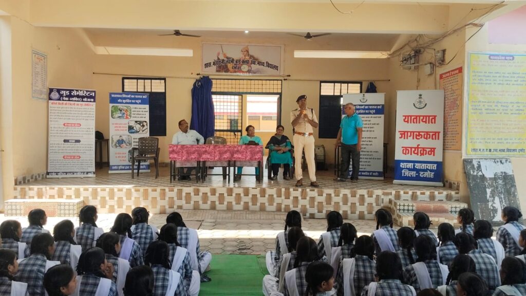 दमोह। श्री सोमवंशी पुलिस अधीक्षक दमोह के निर्देशन व संदीप मिश्रा अतिरिक्त पुलिस अधीक्षक दमोह के मार्गदर्शन में दलवीर सिंह मार्को थाना प्रभारी यातायात द्वारा जिले में हो रही सड़क दुर्घटनाओं के प्रति लोगों को सजग करने हेतु व आम नागरिकों में यातायात नियमों के प्रति जागरूकता अभियान चलाया जा रहा है. 17 अक्टूबर को दलवीर सिंह मार्को थाना प्रभारी यातायात द्वारा शासकीय महारानी लक्ष्मी बाई हा.से. स्कूल दमोह में यातायात जागरूकता कार्यक्रम चलाया गया. इस दौरान उपस्थित स्कूल के करीब 800 छात्र छात्राओं व स्कूल स्टाफ को दो पहिया वाहन चलाते समय हेलमेट पहनने, 18 वर्ष से पूर्व बिना वैध लायसेंस के वाहन न चलाने, इमरजेंसी वाहनों को सदैव रास्ता देने, चार पहिया वाहन में सीट वेल्ट का प्रयोग करने, दो पहिया वाहन में तीन सवारी न बैठने, ओव्हर लोड सवारी वाहनों में सफर न करने की सलाह दी गई.