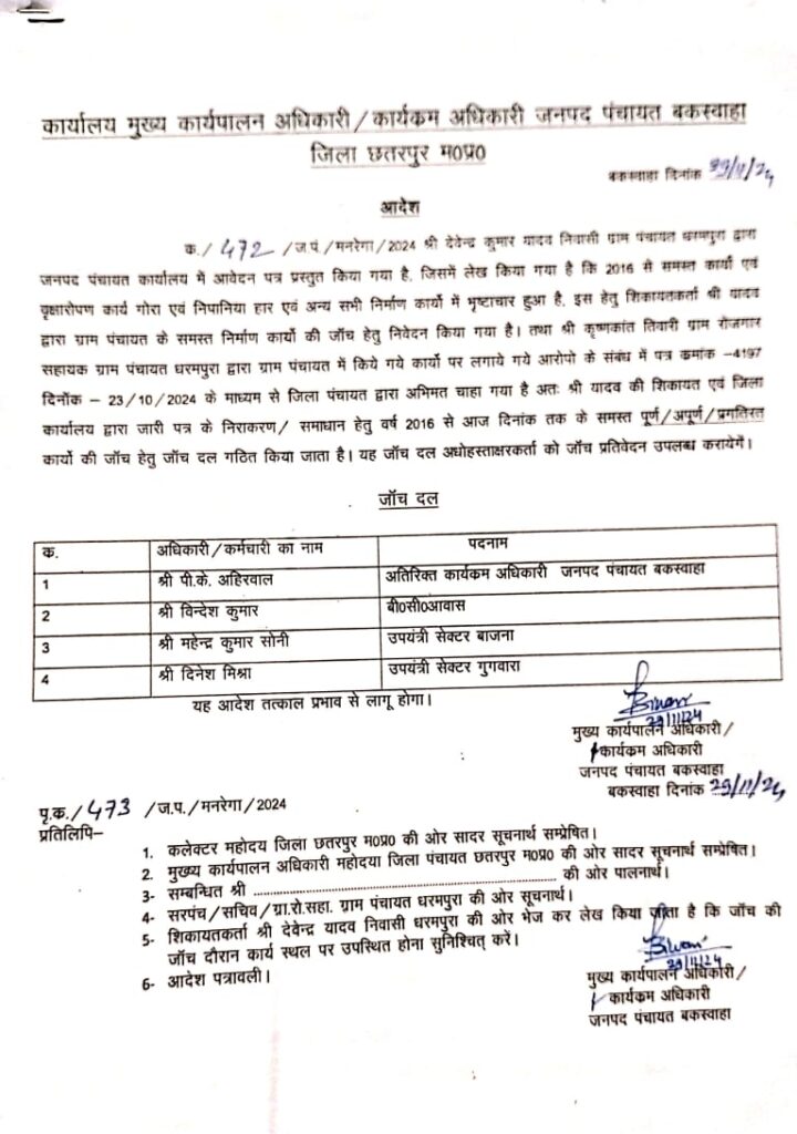 जनपद पंचायत बकस्वाहा के मुख्य कार्यपालन अधिकारी कार्यालय ने ग्राम पंचायत धरमपुरा में किए गए विभिन्न निर्माण कार्यों, वृक्षारोपण और गोरा, निपानिया हार जैसे कार्यों में भ्रष्टाचार के आरोपों की जांच के लिए एक जाँच दल गठित किया है। यह कदम देवेन्द्र कुमार यादव द्वारा 29 सितंबर 2024 को की गई शिकायत पर उठाया गया है, जिसमें उन्होंने आरोप लगाया था कि 2016 से अब तक समस्त कार्यों में भ्रष्टाचार हुआ है।