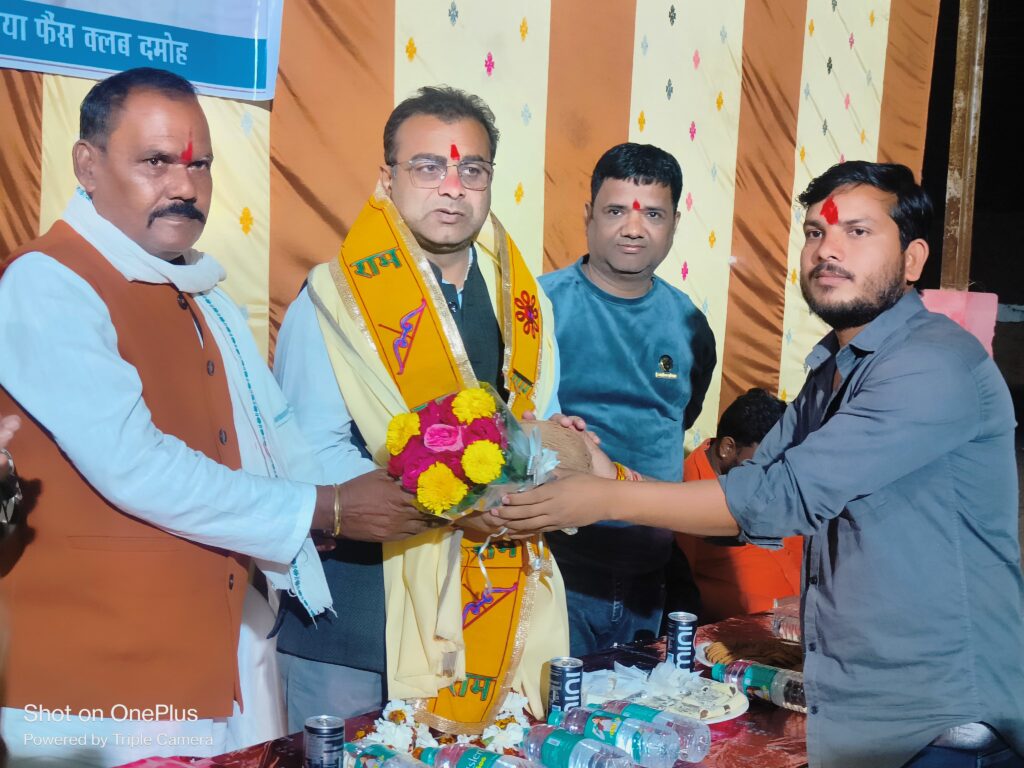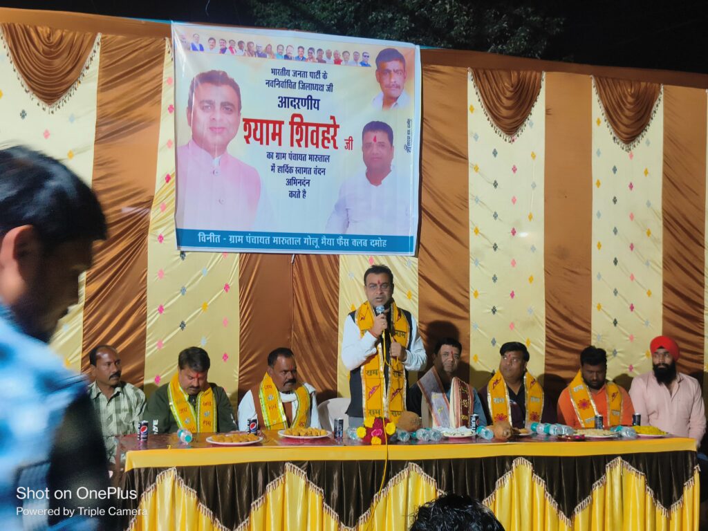 दमोह। भारतीय जनता पार्टी के नवनियुक्त जिला अध्यक्ष श्याम शिवहरे का मारूताल में भाजपा कार्यकर्ताओं और ग्रामीणों के द्वारा सम्मान समारोह कार्यक्रम आयोजित किया गया। भाजपा जिला अध्यक्ष अध्यक्ष श्याम शिवहरे की भव्य आगवानी ढ़ोल ढमाके की धुन पर आतिशबाजी कर हनुमान मंदिर परिसर पहुंचे जहां पर सामुहिक हनुमान चालीसा पाठ का आयोजन किया गया। हनुमान चालीसा पाठ के उपरांत स्वागत समारोह कार्यक्रम का आयोजन भाजपा के पितृ पुरूष पंडित दीनदयाल उपाध्याय के चित्र पर माल्यार्पण कर किया गया। इस दौरान भाजपा कार्यकर्ताओं ने 108 तुलसी की माला साल श्रीफल से भाजपा जिला अध्यक्ष श्याम शिवहरे का सम्मान किया गया।