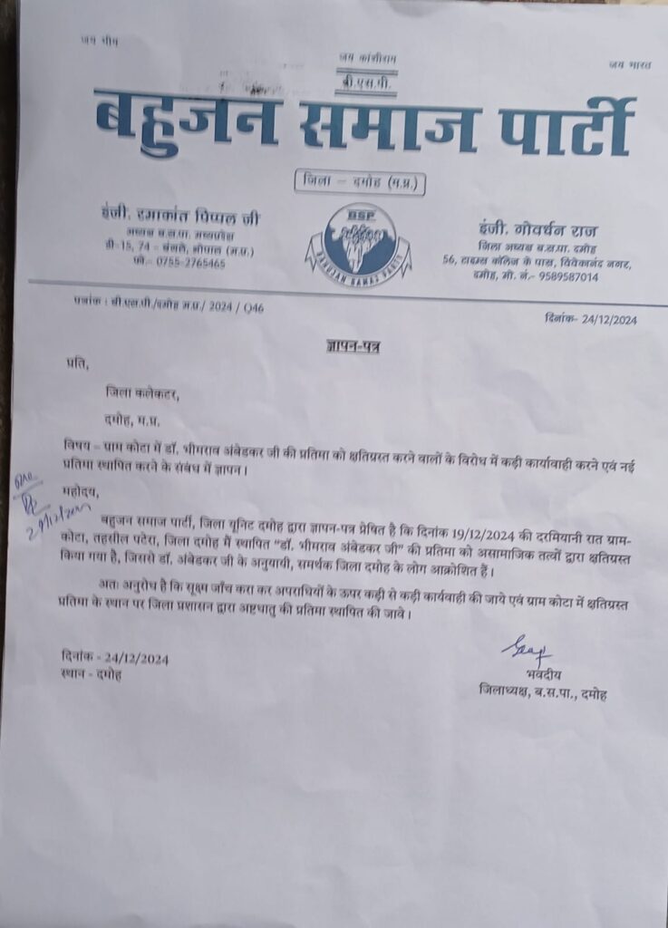 बसपा ने राष्ट्रपति के नाम दमोह कलेक्टर को ज्ञापन सौंपा