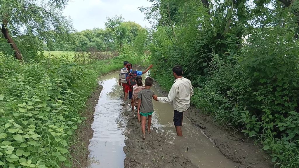 : *हाथ में चप्पल पीठ पर बैंग लेकर कीचड़ से सराबोर सड़क से स्कूल जाते हैं बच्चे*