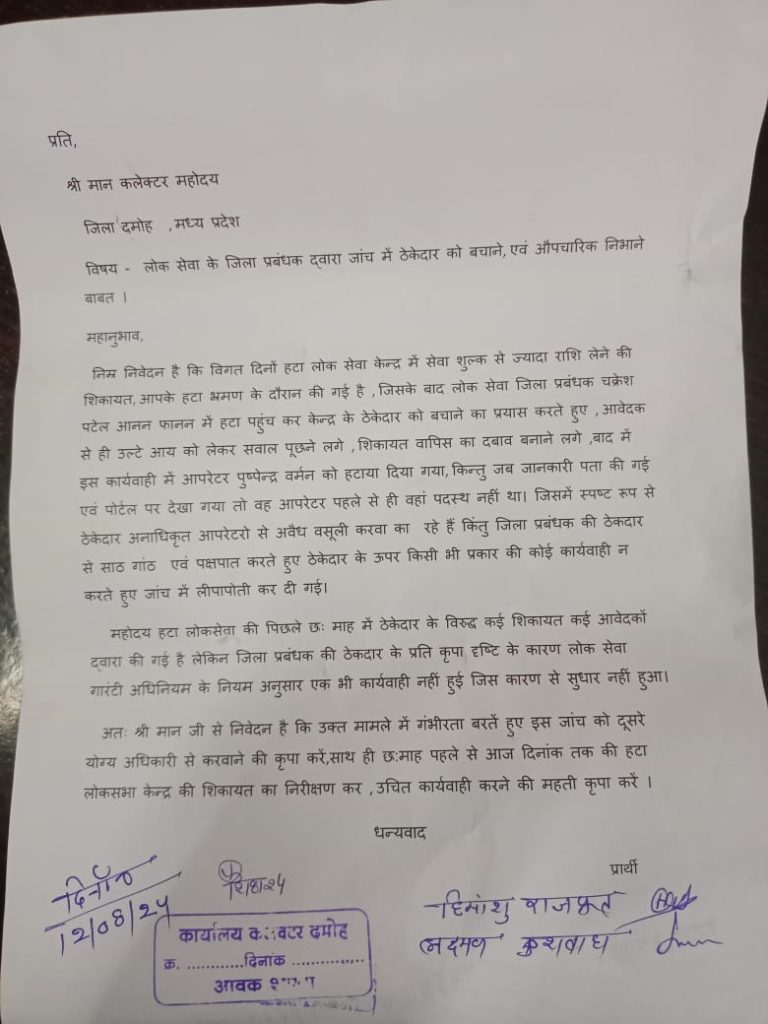 इसी को लेकर आज एक लिखित शिकायत जिला कलेक्टर सुधीर कुमार कोचर के समक्ष की गई जिसमें लोक सेवा के जिला प्रबंधन चक्रेश पटेल द्वारा हटा की लोक सेवा केन्द्र जिसका संचालन मां सिद्धेश्वरी कंस्ट्रक्शन कंपनी द्वारा किया जा रहा है जिसमें अनाधिकृत कम्प्यूटर आपरेटर से अवैध वसूली की शिकायत पर, उसे हटाने की कार्यवाही कर औपचारिकता निभाई गई , एवं ठेकेदार के खिलाफ कोई कार्यवाही नहीं की गई जबकि नियमानुसार ठेकेदार पर कार्यवाही होनी चाहिए थी जो नहीं की गई ,वहीं आवेदन में मांग की गई है कि विगत 8 माह से आज दिनाक में हुई शिकायतों की पुनः जांच के लिए लिखा गया है।