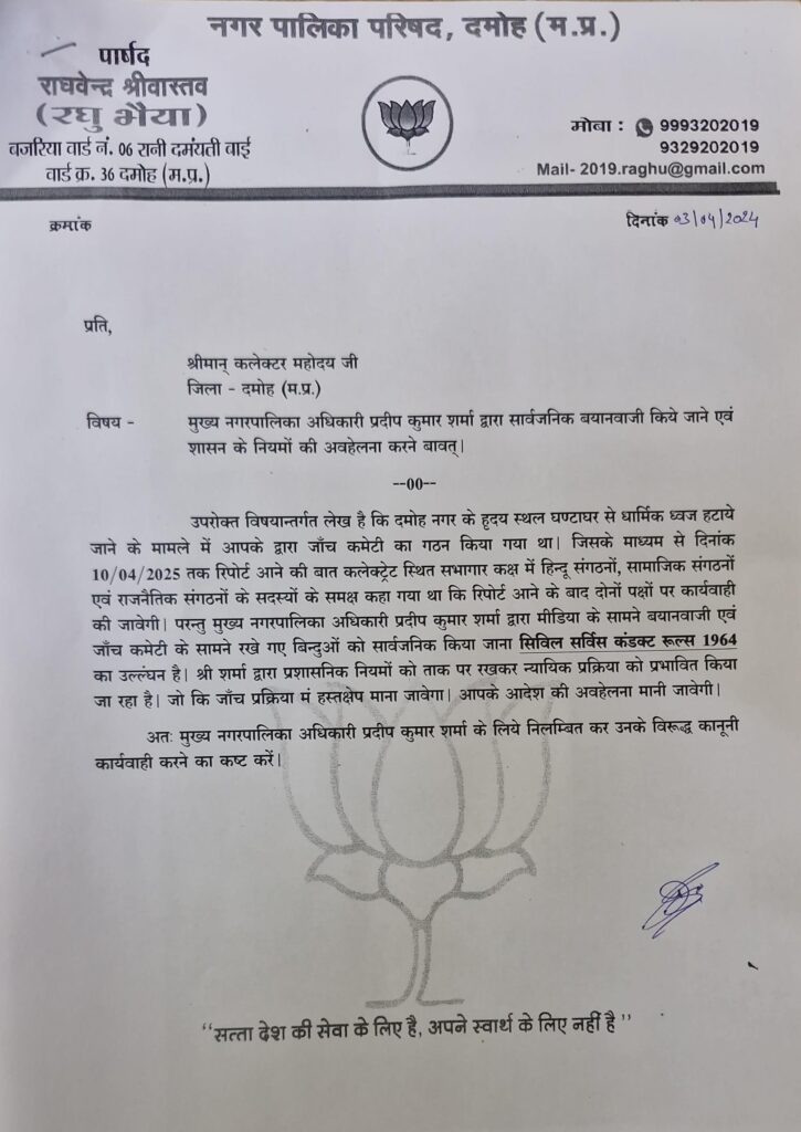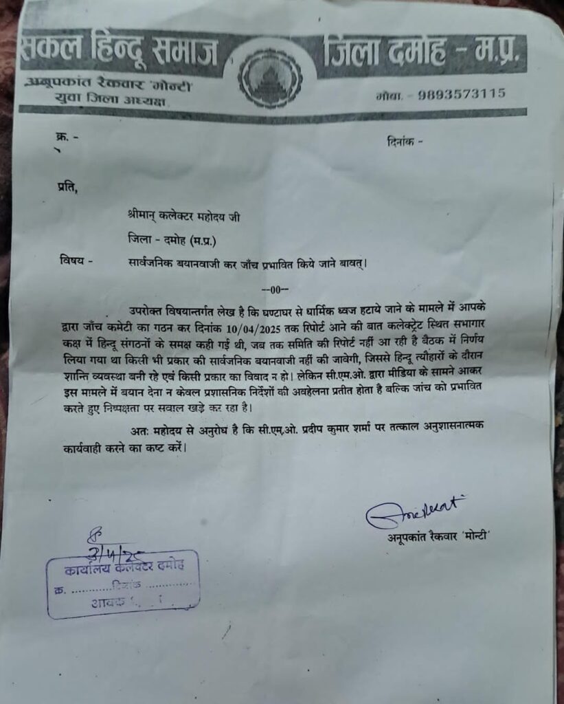 दमोह: गुरुवार को सकल हिंदू समाज एवं भाजपा पार्षद दल ने कलेक्टर दमोह के नाम एक ज्ञापन सोपा जिसमें पिछले दिनों हुई घटना के संदर्भ में नगर पालिका अधिकारी द्वारा प्रेस कॉन्फ्रेंस में जो बयान बाजी की गई उसको लेकर कलेक्टर महोदय के समक्ष ज्ञापन सोपा सकल हिंदू समाज के युवा जिला अध्यक्ष मोंटी रैकवार ने बताया कि धार्मिक ध्वज हटाए जाने के मामले में जांच कमेटी गठन होने के पश्चात किसी भी तरह की बयान बाजी ना करने के लिए कलेक्टर महोदय द्वारा दोनों पक्षों से कहा गया था। ताकि त्यौहार के समय किसी भी प्रकार की शांति व्यवस्था बाधित न हो लेकिन मुख्य नगर पालिका अधिकारी द्वारा प्रशासनिक निर्देशों की अवहेलना करते हुए अपने ऑफिस में मीडिया के सामने घटना के संबंध में बयान बाजी की जो की जांच प्रक्रिया में हस्तक्षेप माना जावेगी