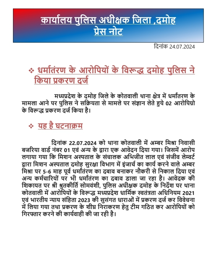 दिनांक 22.07.2024 को थाना कोतवाली में अम्बर मिश्रा निवासी बजरिया वार्ड नंबर 01 एवं अन्य के द्वारा एक आवेदन दिया गया। जिसमें आरोप लगाया गया कि मिशन अस्पताल के संचालक अभिजीत लाल एवं संजीव लेम्वर्ट द्वारा मिशन अस्पताल दमोह सुरक्षा विभाग में इंजार्च का कार्य करने वाले अम्बर मिश्रा पर 5-6 माह पूर्व धर्मांतरण का दबाव बनाकर नौकरी से निकाल दिया एवं अन्य कर्मचारियों पर भी धर्मांतरण का दबाव डाला जा रहा है। आवेदक की शिकायत पर श्री श्रुतकीर्ति सोमवंशी, पुलिस अधीक्षक दमोह के निर्देश पर थाना कोतवाली में आरोपियों के विरूद्ध मध्यप्रदेश धार्मिक स्वतंत्रता अधिनियम 2021 एवं भारतीय न्याय संहिता 2023 की सुसंगत धाराओं में प्रकरण दर्ज कर विवेचना