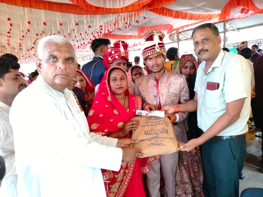 हटा में जब जनपद अध्यक्ष श्री इंद्रपाल पटेल,उपाध्यक्ष श्रीमती राजकुमारी छिरोल्या,जनपद सदस्य श्री कमला गौड,श्रीमती संतोषरानी आदिवासी,श्री जितेंद्र कुमार अहिरवार,श्री प्रियेश कुमार अठया,श्रीमती दशोदा अहिरवार,श्री कन्हैया लाल पटेल,श्री गंगाराम पटेल,श्रीमती रतिबाई पटेल,श्रीमती बृजेश रानी कुर्मी,श्रीमती सरस्वती कुडेरिया,श्री शैलेश पटेल,श्रीमती बृजरानी अहिरवार,श्रीमती अनुसुईया पटेल,श्री महेश्वर सिंह व श्रीमती सुनीता उपाध्याय सभी जनपद प्रतिनिधियों ने मिलकर शासन की योजनाओं से परे व्यक्तिगत रूप से मुख्यमंत्री कन्या विवाह निकाह आयोजन के अंतर्गत स्थानीय कृषि उपज मंडी परिसर में नव दांपत्य जीवन में प्रवेश करने वाले 327 से अधिक जोड़ों के लिए उनकी सुखमय और आनंदित जीवन की कामना करते हुए ठाकुर जी भगवान सिंहासन मूर्ति सहित उपहार स्वरूप भेंट किए गए