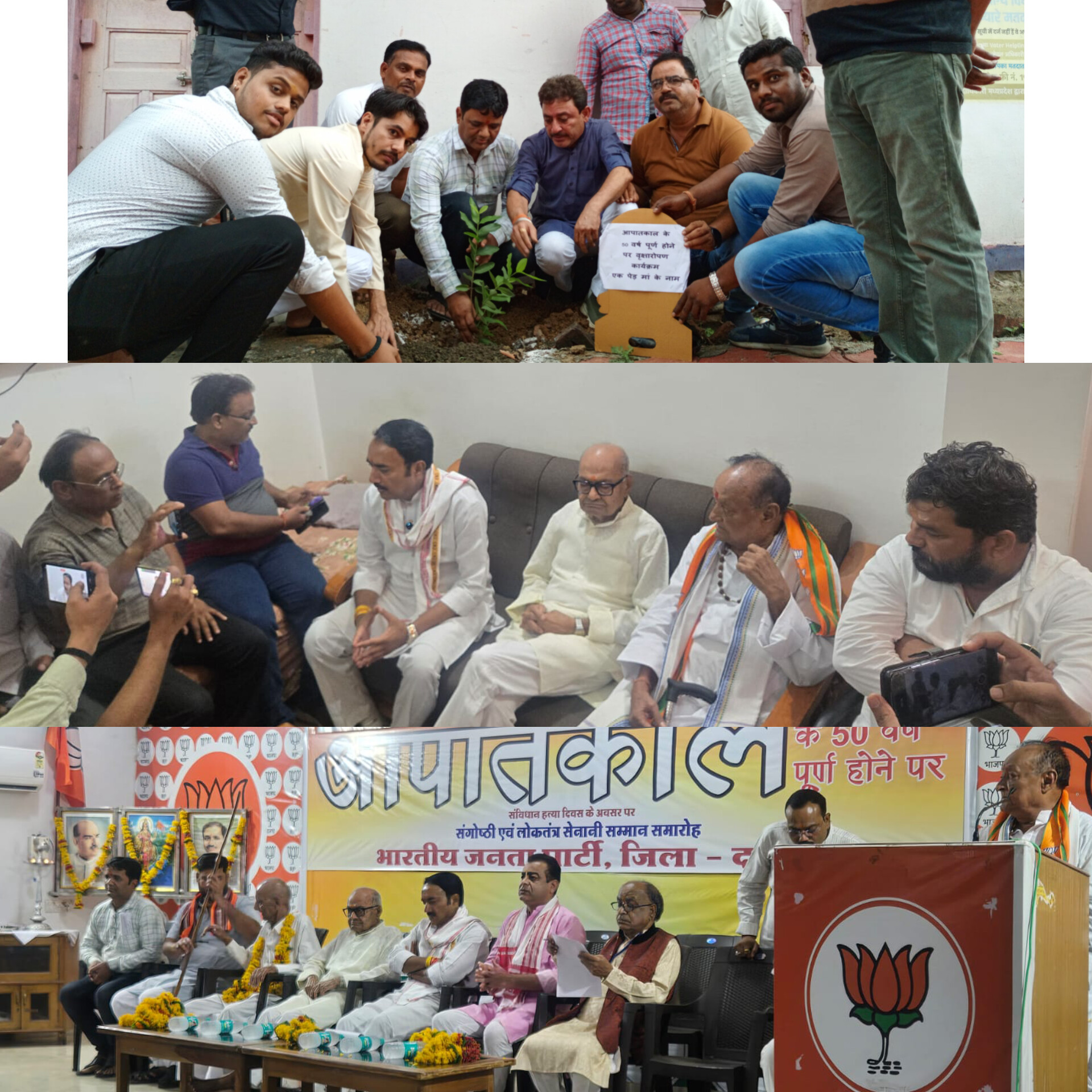 दमोह - भारतीय जनता पार्टी द्वारा आपातकाल के 50 वर्ष पूर्ण होने पर संविधान हत्या दिवस काला दिवस पर संगोष्ठी का आयोजन किया गया जिसमें पूर्व मंत्री बृजेंद्र प्रताप सिंह मुख्य अतिथि के रूप में उपस्थित रहे साथ ही पूर्व मंत्री जयंत कुमार मलैया, जिला अध्यक्ष श्याम शिवहरे, महामंत्री सतीश तिवारी, लोकतंत्र सेनानी संघ जिला अध्यक्ष निर्गुण खरे, वरिष्ठ सेनानी हुकम चंद जैन, पूर्व जिला अध्यक्ष विद्यासागर पांडे संगोष्ठी संयोजक अमित बजाज मंचासीन रहे। संगोष्ठी में लोकतंत्र सेनानी संघ एवं सभी लोकतंत्र सेनानियों का पुष्प हार पहनाकर एवं स्मृति चिन्ह प्रदान कर सम्मानित किया गया