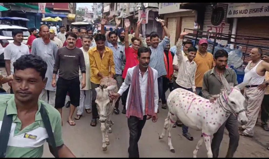: बागेश्वर धाम महाराज के जिले में बारिश काम हो रही लोगों ने गधे और गधी की की शादी बाराती बन के शहर के लोग गधी और गधे के साथ चल रहे हैं यह एक अनोखा अंदाज