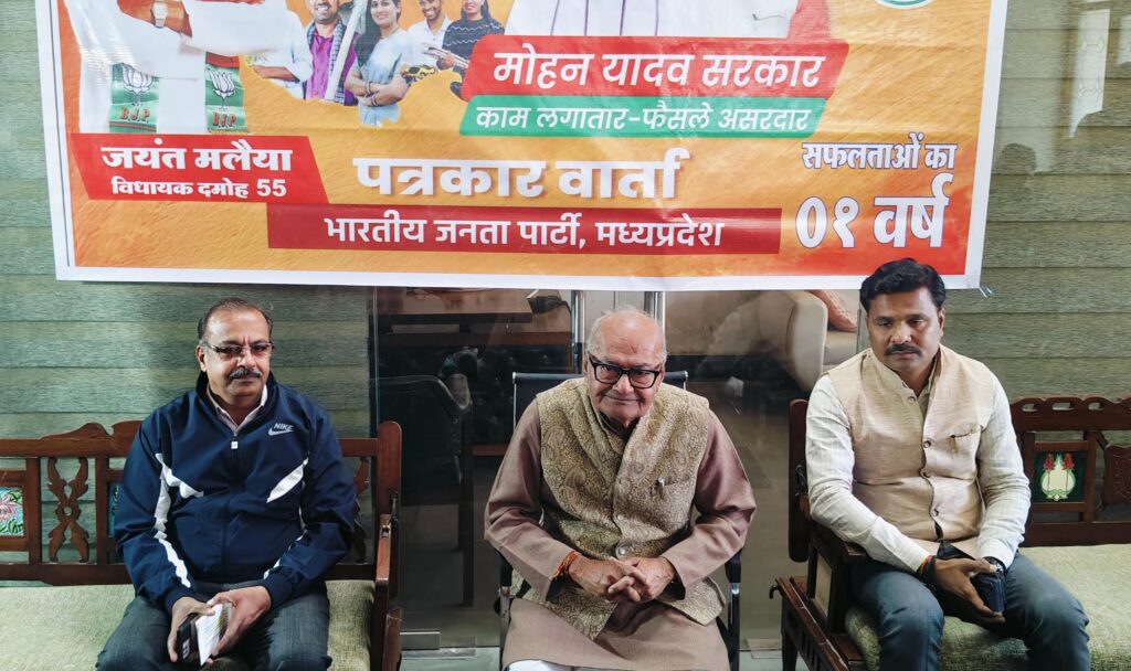 दमोह :-प्रदेश सरकार के एक वर्ष पूर्व होने के उपलक्ष्य में आज पूर्व मंत्री एवं दमोह विधायक जयंत कुमार मलैया ने पत्रकार वार्ता में कहा अत्यंंत हर्ष एवं गौरव का विषय है कि मध्यप्रदेश में 13 दिसंबर 2023 को मुख्यमंत्री डॉ. मोहन यादव के नेतृत्व में गठित सरकार के सफल एवं सार्थक एक वर्ष पूर्ण कर लिया है। उन्होंने कहा हर्ष का विषय है कि प्रधानमंत्री नरेन्द्र मोदी आगामी 25 दिसम्बर को छतरपुर में केन-बेतवा लिंक राष्ट्रीय परियोजना का शिलान्यास करने आ रहे हैं। साथ ही फरवरी-2025 में भोपाल में होने वाली ग्लोबल इन्वेस्टर्स समिट में भी प्रधानमंत्री मोदी पधारेंगे।