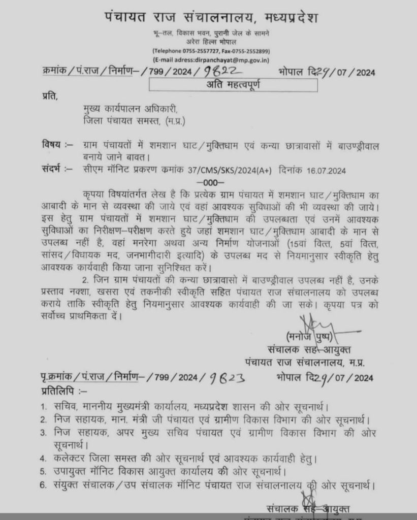 पंचायत राज संचालनालय द्वारा जारी अति महत्वपूर्ण आदेश में सभी जिला पंचायतों को निर्देश दिया गया है कि वे अपने-अपने क्षेत्र में स्थित ग्राम पंचायतों में मुक्तिधाम की उपलब्धता की समीक्षा करें। जहां ये सुविधाएं आबादी के मानक के अनुसार नहीं हैं, वहां मनरेगा, 15वां वित्त, 5वां वित्त, सांसद/विधायक मद और अन्य निर्माण योजनाओं से आवश्यक कार्यवाही की जाए।