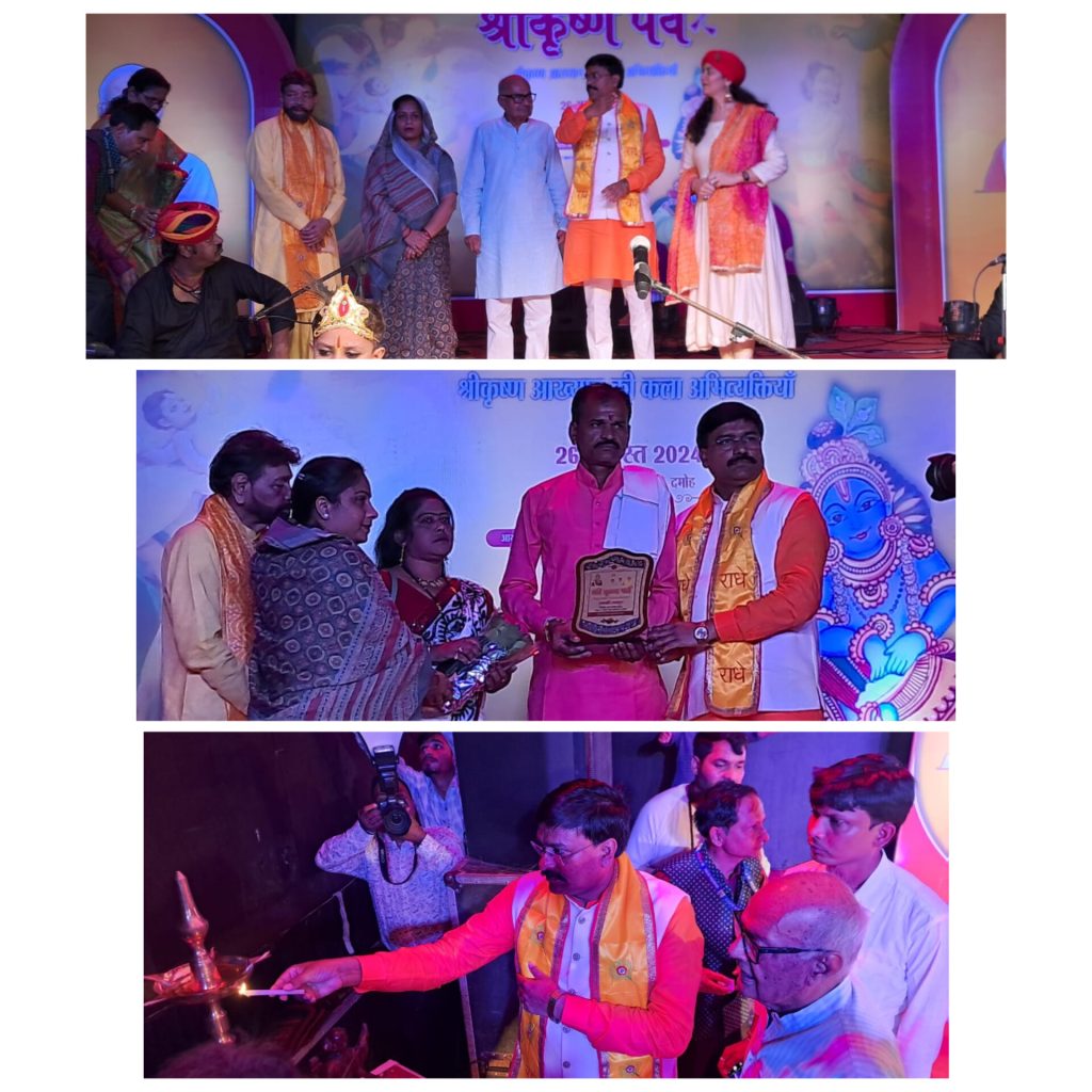 श्रीकृष्ण जन्माष्टमी पर कार्यक्रम जारीदमोह. संस्कृति विभाग मप्र शासन से दमोह आई गायक ममता रानी जोशी, शालिनी खरे और स्थानीय नाटिका प्रस्तुती द्वारा दमोह के मानस भवन में आयोजित कार्यक्रम में राज्य मंत्री (स्वतंत्र प्रभार) श्री धर्मेंद्र सिंह लोधी, पूर्व मंत्री एवं विधायक जयंत मलैया जी, पिछड़ा वर्ग आयोग अध्यक्ष डॉ रामकृष्ण कुसमरिया, जिला पंचायत के अध्यक्ष रंजीता गौरव पटेल, जिला प्रशासन की ओर से कलेक्टर श्री कोचर, एडीएम मीना मसराम, और भी संबंधित अधिकारी गण, क्षेत्रीय जनप्रतिनिधि, दमोह शहर के वरिष्ठ नागरिक जन और भी संगठन मौजूद।