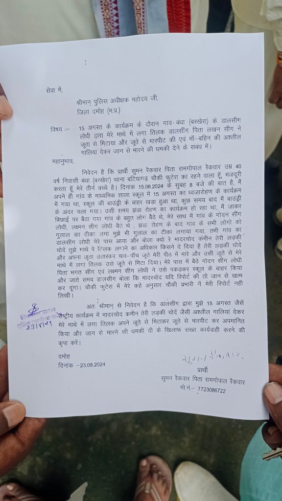 डालसींग द्वारा मुझे 15 अगस्त जैसें राष्ट्रीय कार्यक्रम में मां बहन की गाली कमीन तेरी जैसी अश्लील गालियां देकर ७७/४/२५ मेरे माथे में लगा तिलक अपने जूते से मिटाकर जूते से मारपीट कर अपमानित किया और जान से मारने की धमकी दी डाल सिंह लोधी के खिलाफ सख्त कार्यवाही की जाएTags :
