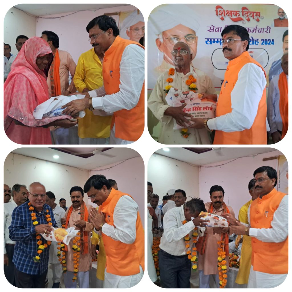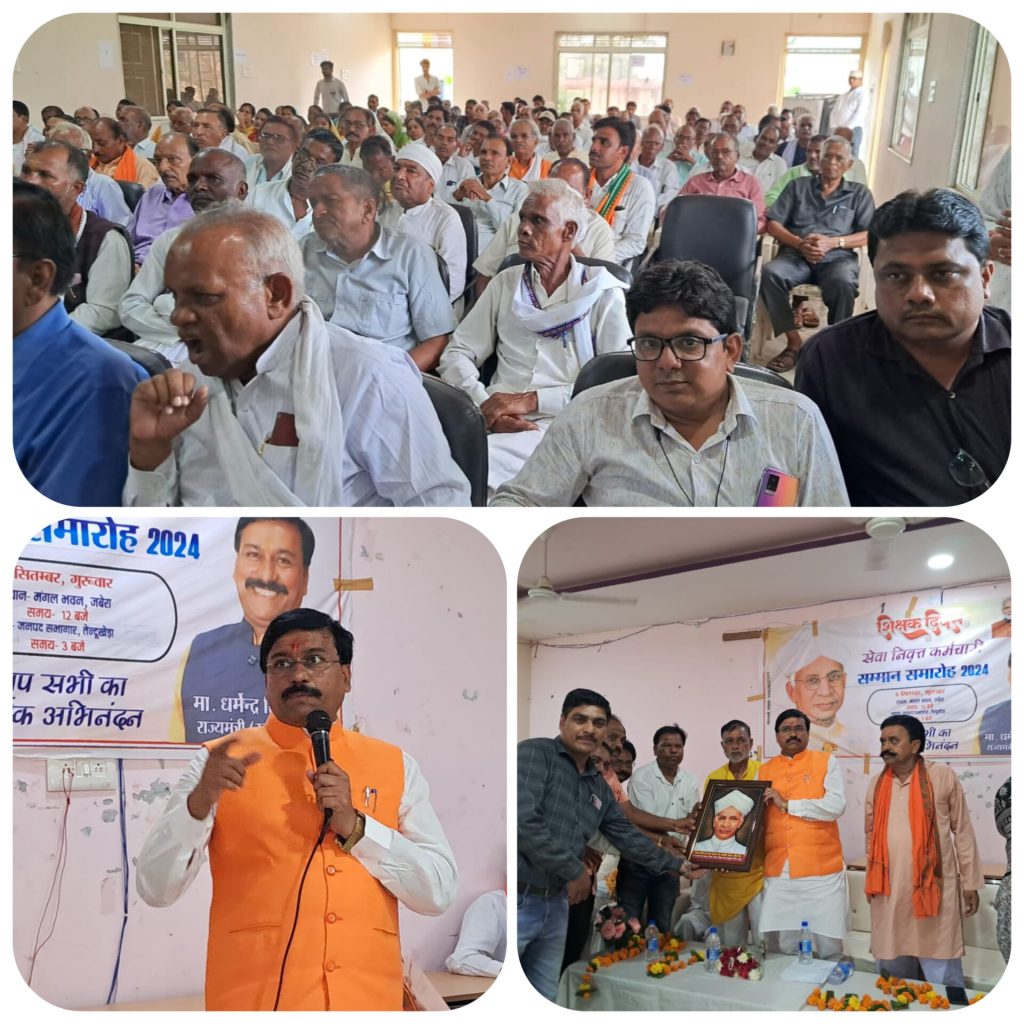 जबेरा विधानसभा के विधायक एवं मध्य प्रदेश शासन में राज्य मंत्री स्वतंत्र प्रभार श्री धर्मेंद्र सिंह लोधी जी के द्वारा सेवानिवृत्त शिक्षक एवं शासकीय कर्मचारी जनों का जबेरा जनपद सभागार एवं तेंदूखेड़ा जनपद सभागार कक्ष में पुष्पमाला अंग वस्त्र श्रीफल से सम्मान किया।