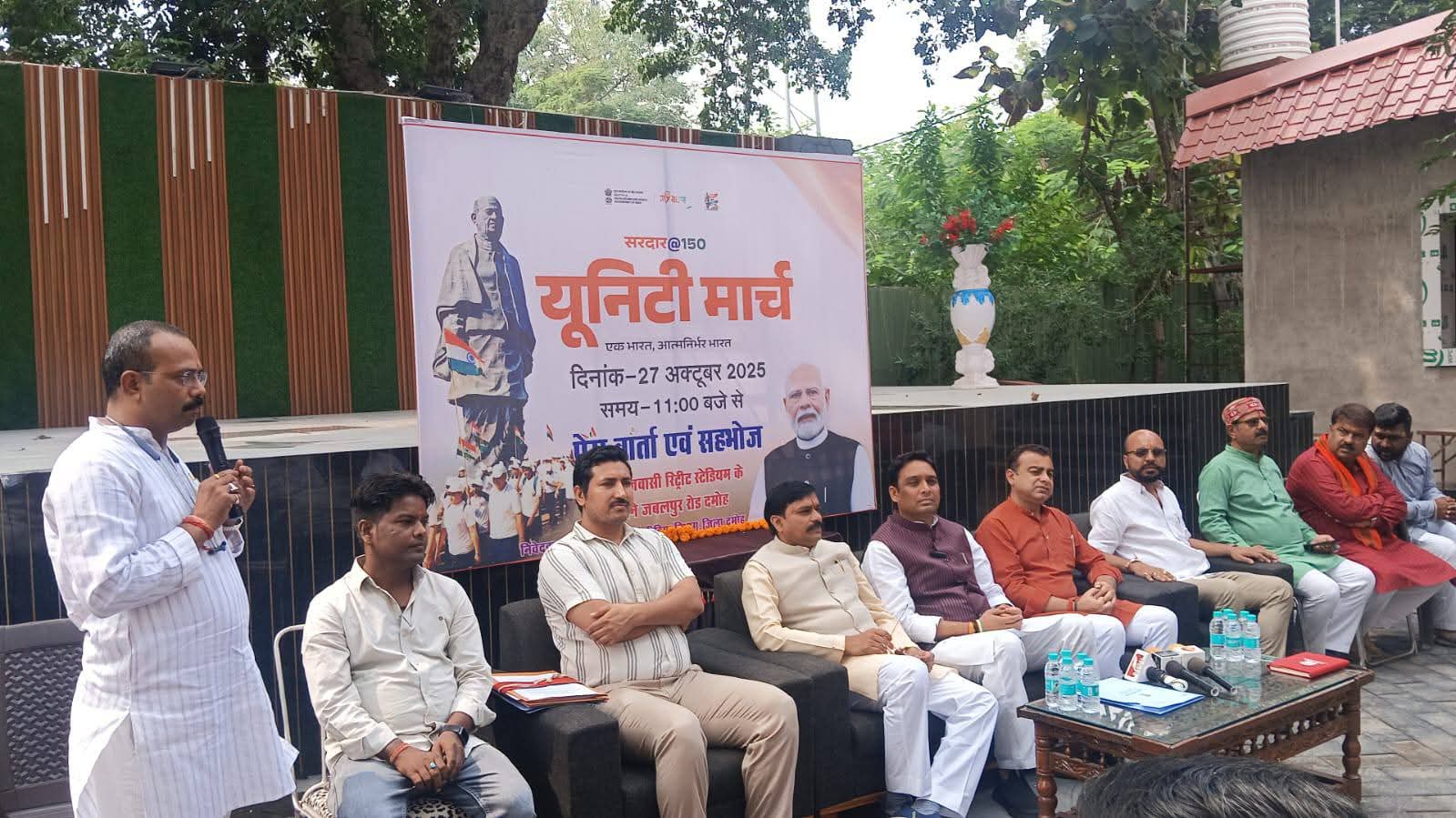 दमोह - लौह पुरुष भारत रत्न सरदार वल्लभभाई पटेल जी की 150वीं जन्म जयंती के उपलक्ष्य में आयोजित होने वाले “सरदार @150 यूनिटी मार्च” के संदर्भ में एक पत्रकार वार्ता का आयोजन किया गया। जिसमें भारतीय जनता पार्टी जिलाध्यक्ष श्याम शिवहरे, मध्यप्रदेश शासन में संस्कृति, पर्यटन, धार्मिक एवं धर्मस्य विभाग राज्यमंत्री स्वतंत्र प्रभार धर्मेन्द्र सिंह लोधी, दमोह संसदीय क्षेत्र सांसद राहुल सिंह लोधी, जिला पंचायत अध्यक्ष श्रीमती रंजीता गौरव पटैल, जिला महामंत्री महेश पटैल, पूर्व जिला महामंत्री गोपाल पटैल, जिला उपाध्यक्ष संजय सेन, जिला मंत्री कपिल शुक्ला, भरत यादव, जिला मीडिया प्रभारी एवं युवा मोर्चा जिलाध्यक्ष प्रिंस जैन, मंडल अध्यक्ष राजेन्द्र चौरसिया, रमाकांत बाजपेयी, युवा मोर्चा जिला उपाध्यक्ष महेन्द्र राठौर मंचासीन रहे।
