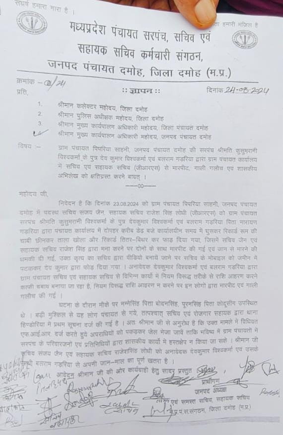 इसी को लेकर ग्राम पंचायत पिपरिया साहनी की सरपंच श्रीमती कुसुम रानी विश्वकर्मा के पुत्र देव कुमार विश्वकर्मा व सरपंच बलराम गडरिया द्वारा ग्राम पंचायत कार्यालय में सचिव व सहायक सचिव (जीआरएस) से मारपीट गाली गलौज व शासकीय अभिलेख को क्षतिग्रस्त करने के संबंध में सभी सचिव, रोजगार सचिव एकत्रित होकर कलेक्ट पहुंचे थे, वहां ज्ञापन लेने वाले कोई मिलने पर जनपद पंचायत की सीईओ पूनम दुबे जी को जनपद कार्यालय दमोह में ज्ञापन सौंपा साथ ही कार्रवाई की मांगकी।