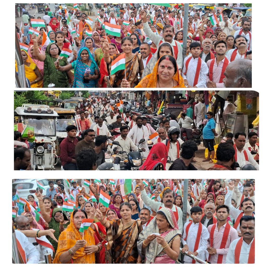 *दमोह* दमोह जिला मुख्यालय से जहां पर आज भगवती मानव कल्याण संगठन के हजारों कार्यकर्ताओं ने दमोह जिला मुख्यालय के मुख्य मार्गों पर तिरंगा यात्रा निकालकर दमोह जिला वासियों को नशा मुक्ति का संदेश दिया आपको बता दें भगवती मानव कल्याण संगठन विगत 20 वर्षों से नशा मुक्ति के लिए कार्य कर रहा है उसी क्रम में आज भगवती मानव कल्याण संगठन के तत्वाधान में हर माह की भांति मां के दूसरे रविवार को मासिक महा आरती का क्रम दमोह जिला गल्ला मंडी प्रांगण में रखा गया महा आरती कम के पश्चात महिलाएं बच्चे एवं क्षेत्रीय लोगों ने बड़ी संख्या में भगवती मानव कल्याण संगठन के लोगों के साथ दमोह गल्ला मंडी सागर नाका से नशा मुक्ति यात्रा प्रारंभ कर तिरंगा यात्रा निकालते हुए तीन गुल्ली चौराहे से स्टेशन चौराहा होते हुए दमोह के हृदय स्थल घंटाघर से निकलकर जिला अस्पताल के सामने बाबा साहेब अंबेडकर की प्रतिमा को माल्यार्पण करते हुए तिरंगा यात्रा का समापन किया समापन के अवसर पर भगवती मानव कल्याण संगठन के जिला अध्यक्ष पंडित राकेश तिवारी ने मीडिया को संबोधित करते हुए भारत को हिंदू राष्ट्र बनाने एवं दमोह को नशा मुक्ति बनाने का संकल्प लोगों को दिलाने की बात कही इसी क्रम में भारतीय शक्ति चेतना पार्टी की राष्ट्रीय सचिव आरती सिंह ठाकुर ने नशा विरोधी आंदोलन को गति देने की बात कही एवं लोगों से नशा मुक्त रहते हुए दमोह जिले को नशा मुक्ति दमोह खुशहाल दमोह बनाने की बात कही