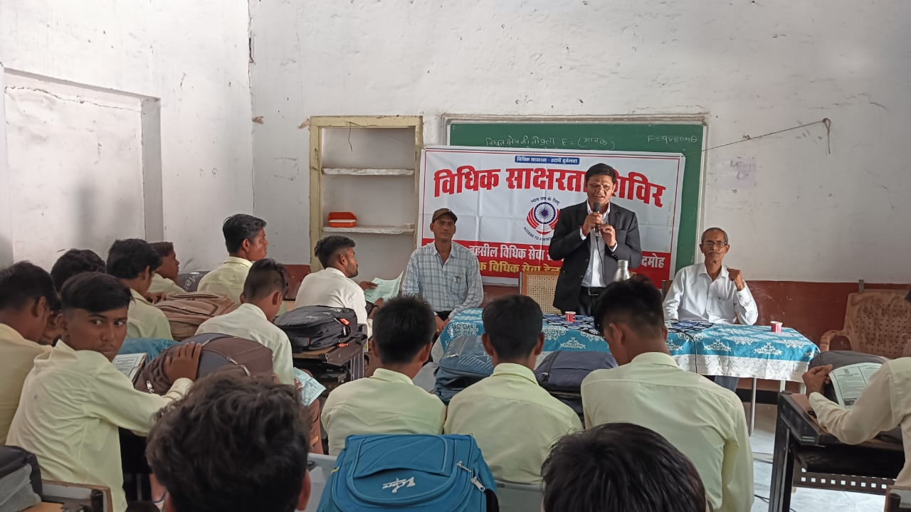 माननीय आनंद कुमार तिवारी प्रधान जिला न्यायाधीश/अध्यक्ष महोदय जिला विधिक सेवा प्राधिकरण दमोह के निर्देशानुसार तथा माननीय श्री धर्मेश भट्ट जिला न्यायाधीश एवं सचिव जिला विधिक सेवा प्राधिकरण दमोह के मार्गदर्शन में श्रीमान न्यायिक मजिस्ट्रेट एवं अध्यक्ष तहसील विधिक सेवा समिति पथरिया श्री राजेंद्र बर्मन की अध्यक्षता में शासकीय उत्कृष्ट विद्यालय पथरिया में किया गया विधिक साक्षरता शिविर का आयोजन ।